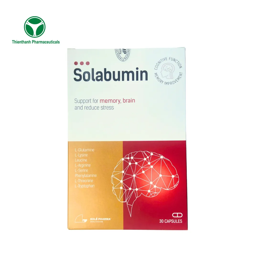 Solabumin là viên uống bổ sung phức hợp 14 acid amin quan trọng như L-Glutamin, Lysin, Leucin, Arginin, Phenylalanin, Threonin, Tryptophan… giúp phục hồi thể lực, tăng cường trí nhớ, cải thiện sức khỏe toàn diện và hỗ trợ hoạt động của não bộ. Sản phẩm được nhập khẩu từ Latvia, đạt tiêu chuẩn chất lượng châu Âu và đã được cấp số ĐKSP tại Việt Nam.